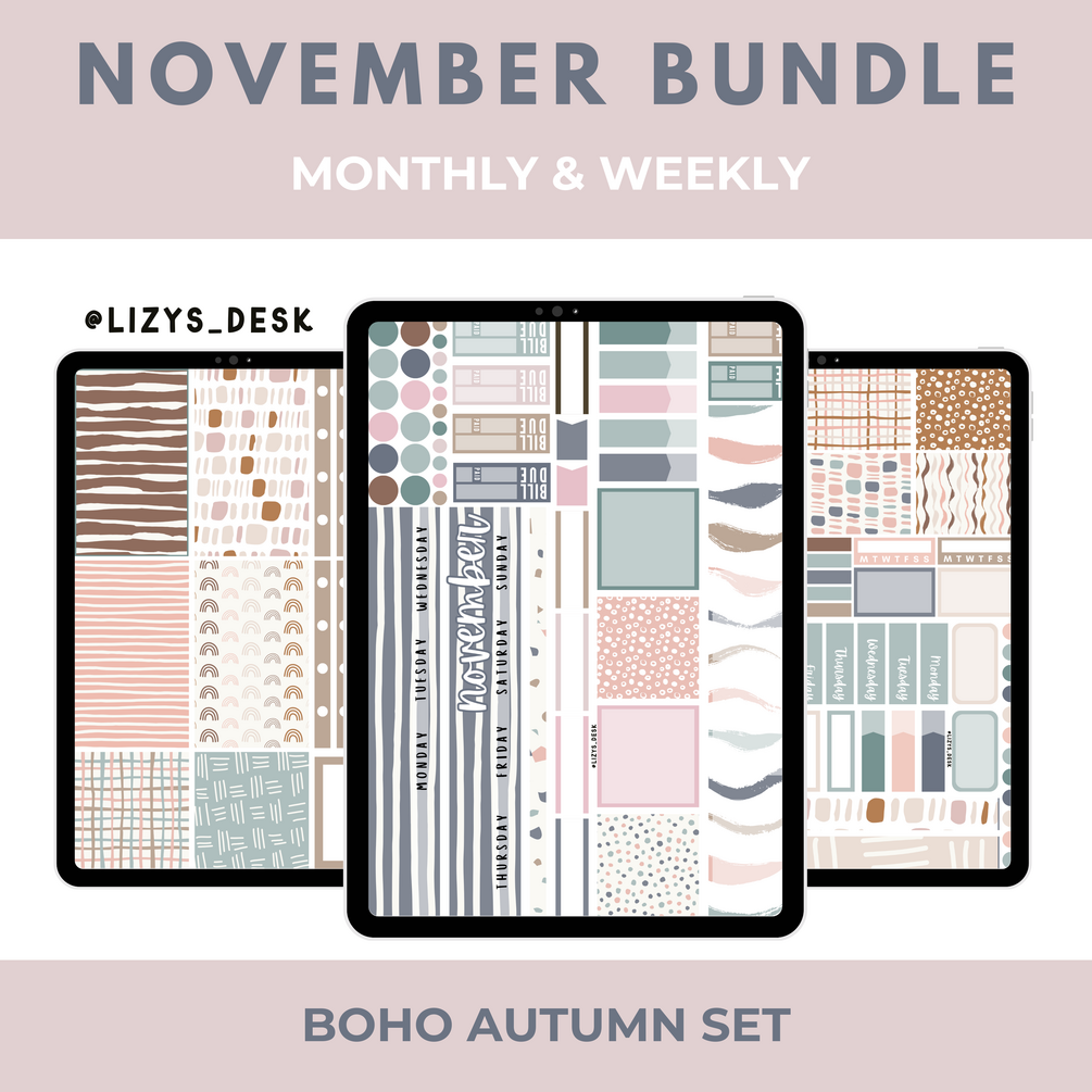Embrace cozy boho vibes this fall with this warm and earthy digital sticker set! Designed for your monthly and weekly spreads, this collection adds a soft, natural aesthetic to your digital planner.